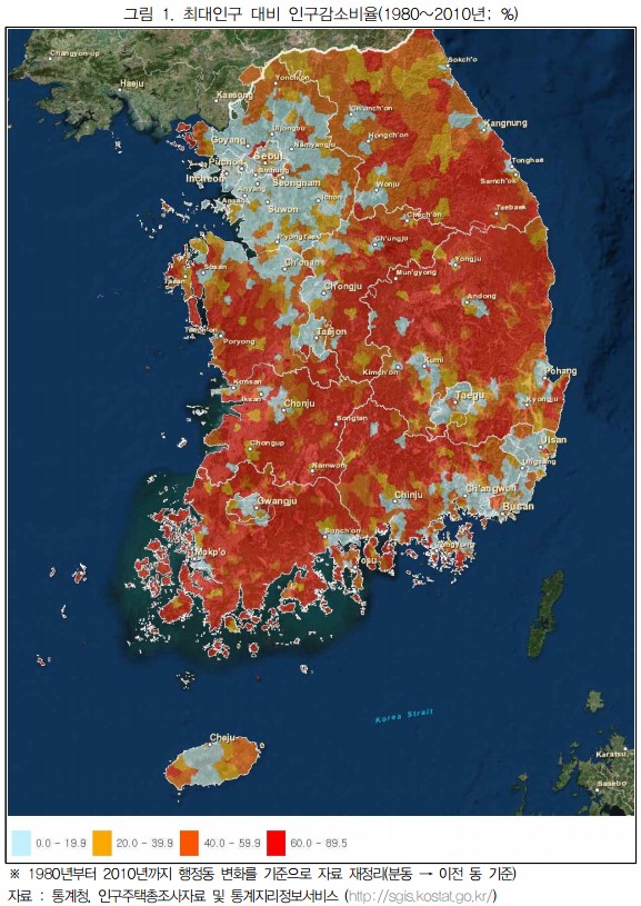1980년부터 2010년까지의 인구주택총조사자료를 바탕으로 이 시기(30년간)의 가장 많은 인구에 비해서 2010년 인구가 20% 이상 감소한 지역의 분포를 살펴보면 그림 1과 같다. 이를 살펴보면 수도권과 대도시 인근을 제외한 거의 모든 지역에서 뚜렷한 인구쇠퇴현상이 나타남을 확인할 수 있다.