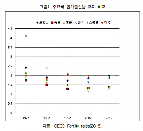 1970년대부터 2012년까지 지난 40여 년간 주요국들의 합계출산율을 비교해보더라도 우리만큼 출산율이 급격히 감소한 나라도 드물다. 1990년대 초에 저출산 위기에 직면한 프랑스, 독일, 일본 등도 자구책을 마련하면서 반등의 발판을 마련했지만, 우리는 계속 최하위 수준에서 정체되어 있다(그림1 참고).