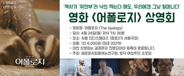 영화 ‘어폴로지’ 상영회! 함께 보아요!By 새사연 미디어회원센터|2018-06-29T17:02:36+09:002017/04/10|Categories: 새사연 공지|Read More 0