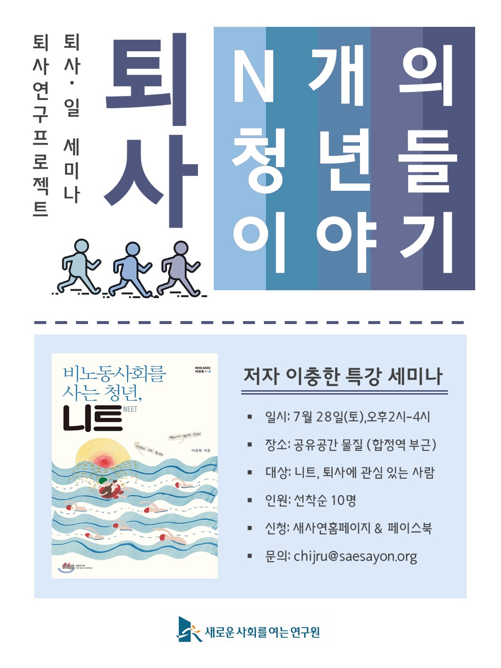 퇴사연구 프로젝트팀에서는 지난 6~7월 동안, 노동 연구자 및 퇴사자들과 매주 토요일에 만나 ‘퇴사/노동 세미나’를 진행했습니다. 마지막 세미나에서는 보다 많은 분들을 만나고 싶다는 바람으로, 신간 <비노동사회를 사는 청년, 니트>의 저자 이충한 선생님을 모시고 공개 세미나를 진행하려고 합니다.