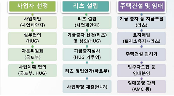 다음은 리츠 설립이다. 리츠(REITs, Real Estate Investment Trusts)란 「부동산투자회사법」 에 따라 다수의 투자자로부터 자금을 모아 부동산, 부동산 관련 증권 등에 투자·운영하고 그 수익을 투자자에게 돌려주는 부동산 간접투자기구인 주식회사다. 구체적인 예를 들자면 ㈜대한제10호뉴스테이위탁관리부동산투자회사는 위스테이별내 공급·운영을 위하여 설립된 리츠인데, 자본(출자), 부채(융자, 임차보증금)로 총사업비(자산)를 조달하고 이를 통해 위스테이별내를 공급·운영한다. 그리고 발생하는 수익은 이해관계자에게 분배하며 위스테이별내 사업의 종료와 함께 청산된다. 일반 주식회사가 영속기업을 가정하는 것과 상반되게 리츠는 특수한 목적에 따라 설립되고 목적을 달성할 경우 청산된다는 점이 특징이다.