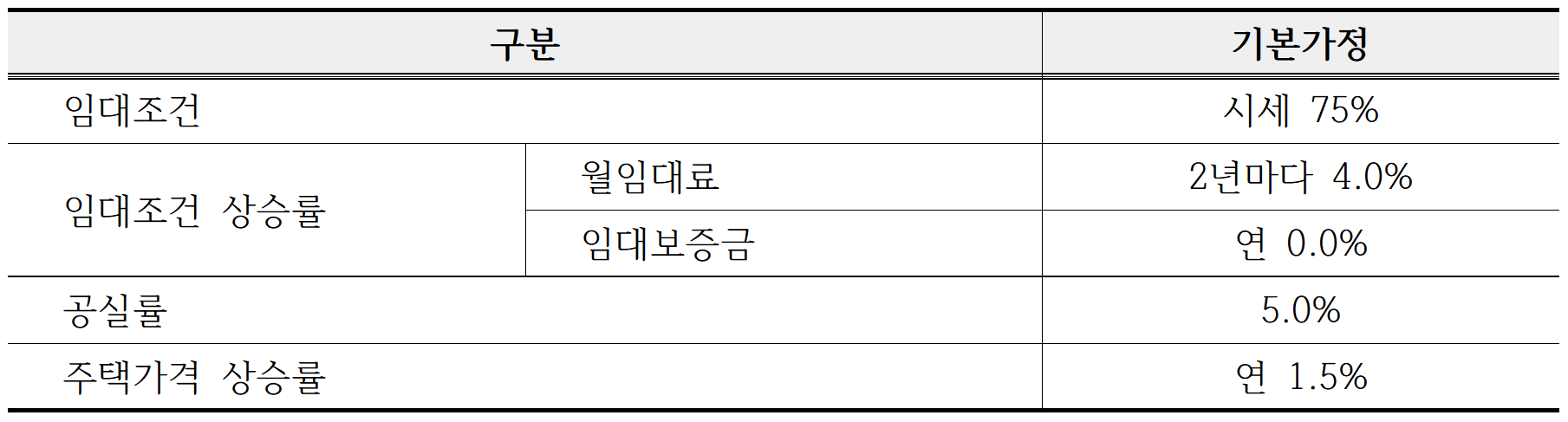 ▲ 위스테이별내 임대운영 조건 가정(최명섭 외. 2017. 건설형 뉴스테이 임대주택리츠의 수익-위험 분석. 일부수정)