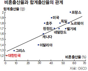 ▲ 비혼출생율과 합계출생율의 관계