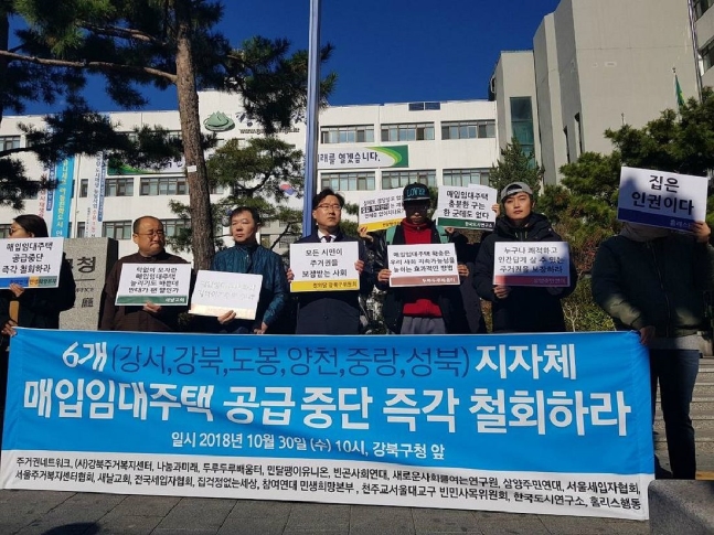 이어 같은 달 30일 주거권 관련 시민단체들은 6개 자치구 중 하나인 강북구의 청사 앞에서 기자회견을 열고 6개 자치구를 규탄하며 매입임대주택 매입 자제 요청을 철회할 것을 요구했다. 이들은 매입 자제 지역으로 지정된 6개 지역의 주거빈곤율(최저주거기준 미달, 주택 이외의 거처 비율)은 서울시 평균보다 대체로 높다며 주거빈곤율이 높은 지역에서 매입임대주택을 자제해달라고 요청한 건 납득하기 어렵다고 했다.