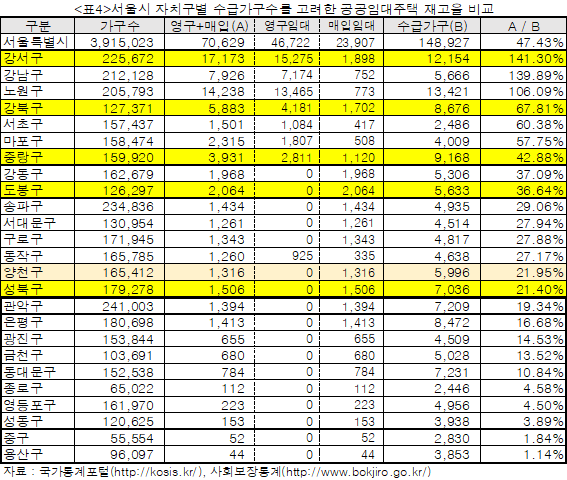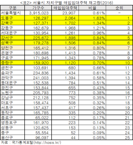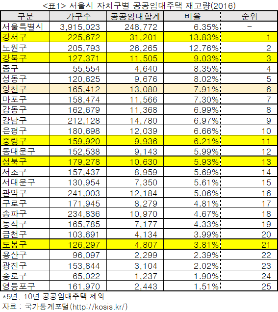 먼저 6개 자치구가 매입임대주택 매입 자제 요청을 하게 된 맥락을 알아보기 위해 우선 <표1>과 같이 2016년 기준 서울 시내 25개 자치구의 가구수 대비 전체 공공임대주택(5년, 10년 공공임대주택제외) 재고량을 비교해보자. 전체적으로 봤을 때 6개 자치구의 공공임대주택 비율은 강서구와 강북구처럼 높은 경우도 있지만 도봉구처럼 낮은 경우도 있어 특별한 경향이 있다고 보기 어렵다. 적어도 이 표만 놓고 보면 이번 갈등은 특별한 구조적 문제없이 한겨레신문의 보도처럼 주민들의 님비현상이 이번 사건의 원인이라고 결론내릴 수도 있을 것이다.