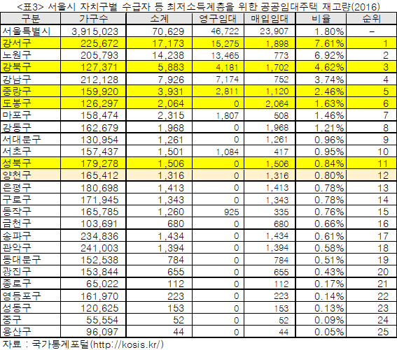같은 맥락에서 <표3>을 보자. 이 표는 수급자 등에게 우선 공급되는 두 유형(영구임대주택, 매입임대주택)을 합산하여 25개 자치구의 각 가구수 대비 비율을 비교한 것이다. <표2>와 순서는 조금 바뀌었지만 상위 6개 자치구 중 4개가 매입 자제 요청을 한 것은 동일하다는 것을 확인할 수 있다. 특히 중랑구의 경우, <표2>에서 서울시 25개 자치구 중 매입임대주택의 비율이 10번째 수준이었지만 영구임대주택을 합산할 경우 비율은 5번째가 된다. 중랑구 입장에서는 기존 수급자 우선 공공임대주택인 영구임대주택 재고량이 있기 때문에 매입임대주택 추가 공급·운영이 부담스럽고 이에 따라 매입 자제 요청을 한 것이라고 볼 수 있다. 이처럼 정황을 고려했을 때 이번 6개 자치구의 매입 자제 요청은 추가 공급에 따른 사회복지 업무 부담 호소라고 해석하는 것이 타당할 것이다. 물론 여기에 지역 주민들의 님비현상이 더해졌을 수는 있지만 말이다.