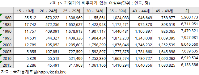 제목부터 무슨 뚱딴지같은 소리냐고 반문할지 모르겠다. 그러나 2015년 기준 전국 20~39세 배우자가 있는 여성의 출산율은 30년 전인 1985년의 그것보다 높은 것이 사실이다. 일단 어떻게 도출된 값인 지부터 알아보자. 먼저, 국가통계포털(http://kosis.kr/)에 접속해서 5년마다 수행되는 인구주택총조사 자료 중 가임기(15세부터 49세까지)의 배우자가 있는 여성수를 5세 단위로 나눠 아래 표와 같이 정리했다.
