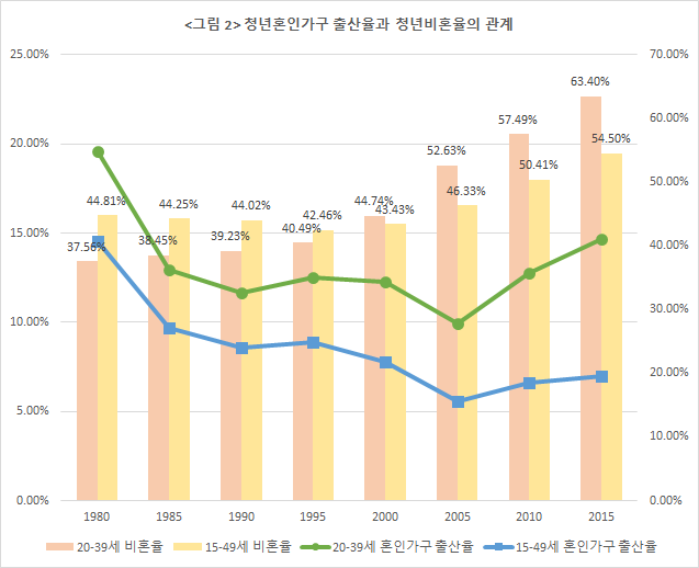 세 출산율 지표는 널리 알려진대로 1980년에 비해 2015년의 출산율이 낮다는 점을 공통적으로 보여준다. 그런데 혼인여부와 관계없이 계산되는 합계출산율이 하향 추세를 유지하고 있는데 비해, 혼인가구만을 대상으로 산출한 출산율 그래프(동그라미, 네모)는 2005년을 기점으로 반등하기 시작했다. 특히, 청년(20~39세) 혼인가구 출산율은 반등의 정도가 더욱 강하여 2015년(14.65%)에는 1985년(12.95%)의 수치를 넘어섰다. 청년혼인부부의 2015년 출산율이 1985년보다 높은 현상은 과거에 비해 청년의 출산과 혼인의 상관관계가 높아졌다는 것을 의미한다. 출산율이 역대 최저치를 갱신했다는 언론 보도에 익숙한 상황에서 그것이 구체적으로 무엇이든지 간에 2015년의 출산율 데이터가 1985년보다 높다는 것은 언뜻 생각해서는 납득하기 쉽지 않다. 이 현상은 어떻게 해석해야 할까.