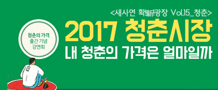 2017 청춘시장: 내 청춘의 가격은 얼마일까 흙수저로 태어나 달관과 포기를 먼저 깨달은 세대의 생활과 생존 청춘에게 붙어 있는 가격표와 청춘/사회의 손익 비교표를 쓴 ‘청춘의 가격’ 출간 기념 강연회에 새사연 회원님들을 초대합니다. 강연자: 강세진, 송민정, [...]