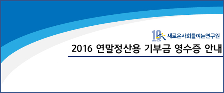 2016 연말정산용 기부금 영수증 안내 올 한해도 한결같은 관심과 성원으로 새사연을 후원해주셔서 진심으로 감사드립니다. 회원님의 후원금은 생활인을 위한 연구에 귀중한 자원으로 활용되고 있습니다. 2016년 연말 정산 기부금 영수증에 대해 안내해드리니 아래의 내용을 참고해주시길 바랍니다. 1. [...]