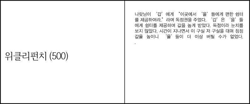 우화(寓話) 나랏님이 ‘갑’에게 “이곳에서 ‘을’들에게 편한 쉼터를 제공하여라.”라며 독점권을 주었다. ‘갑’은 ‘을’들에게 쉼터를 제공하며 값을 높게 받았다. 독점이라 눈치를 보지 않았다. 시간이 지나면서 이 구실 저 구실을 대며 점점 값을 높이니 ‘을’들이 더 이상 버틸 [...]